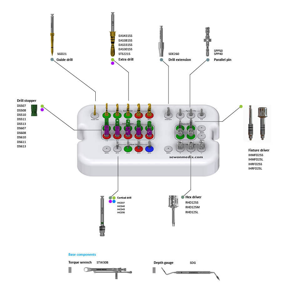 Extra Kit is a kit that can satisfy both patients and doctors by reducing the implant operation time with excellent durability and cutting power in various bone quality. The Extra drill included in the Kit is designed with an angle in the same way as the shape of the IH fixture, so it helps to secure the initial fixing forces. In addition, the drill stopper ensures accurate and safe drilling depth.