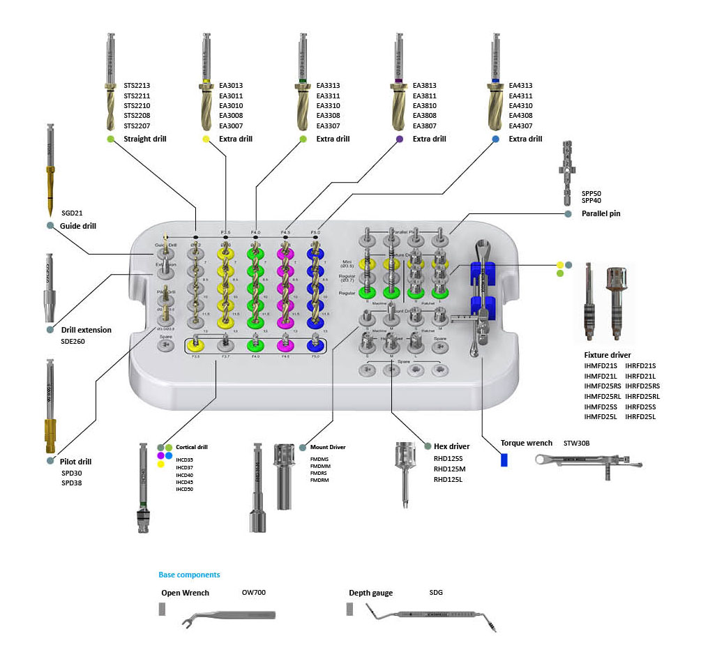 The Full-Kit consists of all lengths of drills. This kit can be used in various oral environments. Line-marked on tin-coating provides excellent ability to verify the depth during drilling procedure. Also have stop function with drill, user can use more safely. Kit have configured to apply all products of IH fixture.